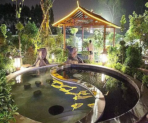 园区上百个露天温泉泡池,四十多种特色温泉,浓郁豪迈的白酒泉、红酒泉、咖啡泉,养颜美容的牛奶泉、椰汁泉、柠檬泉,健体养生的人参泉、当归泉,富于刺激的冰泉和热泉,充满浪漫的玫瑰泉、雾泉等,在这里,泡汤已化身为提升心灵的养生艺术;